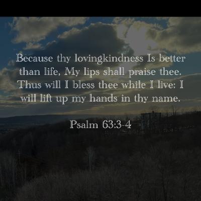 O God, thou art my God; early will I seek thee: my soul thirsteth for thee, my flesh longeth for thee in a dry and thirsty land, where no water is; To see thy power and thy glory, so as I have seen thee in the sanctuary. Because thy lovingkindness is better than life, my lips shall praise thee. Thus will I bless thee while I live: I will lift up my hands in thy name. My soul shall be satisfied as with marrow and fatness; and my mouth shall praise thee with joyful lips: When I remember thee upon my bed,and meditate on thee in the night watches. Because thou hast been my help, therefore in the shadow of thy wings will I rejoice. My soul followeth hard after thee: thy right hand upholdeth me. But those that seek my soul, to destroy it, shall go into the lower parts of the earth. They shall fall by the sword: they shall be a portion for foxes. But the king shall rejoice in God; every one that sweareth by him shall glory: but the mouth of them that speak lies shall be stopped.