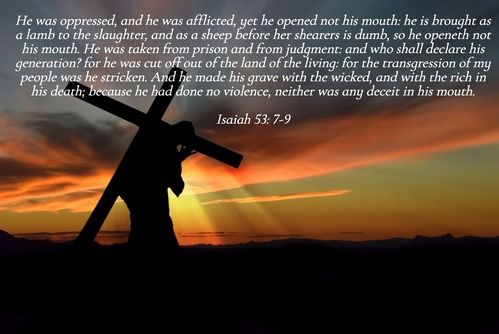 But he was wounded for our transgressions, he was bruised for our iniquities: the chastisement of our peace was upon him; and with his stripes we are healed. All we like sheep have gone astray; we have turned every one to his own way; and the LORD hath laid on him the iniquity of us all. He was oppressed, and he was afflicted, yet he opened not his mouth: he is brought as a lamb to the slaughter, and as a sheep before her shearers is dumb, so he openeth not his mouth. He was taken from prison and from judgment: and who shall declare his generation?